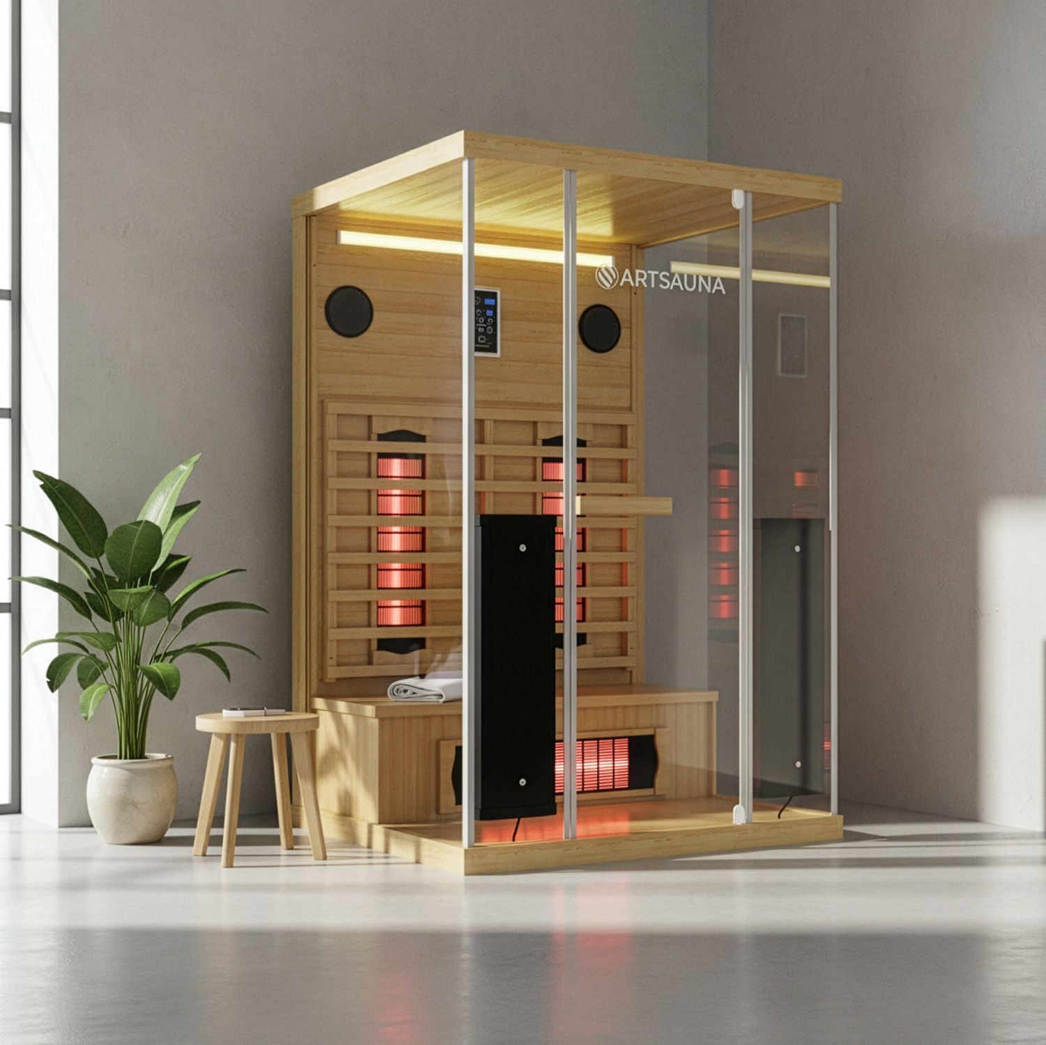 Infrarotwärme unterstützt Regeneration, lockert Muskeln und fördert die Durchblutung. Die Infrarotkabine Göteborg von Artsauna bietet dank der Vollspektrumstrahler mit 1850 W Leistung für gezielte Tiefenwärme. Aus echtem Hemlockholz gefertigt, überzeugt die Kabine durch ihr hochwertiges Naturholzdesign, ergänzt durch 8 mm Sicherheitsglas an Tür und